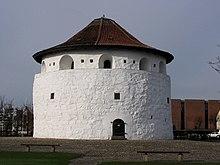 In 1627 under Kejserkrigen, Melchior von Hatzfeldt troops built a Sconce north of the fishing village.[8][5]:95 The sconce became known as Nordre Skanse and is preserved to this day.[8] After the war this was manned by Danish troops.[5]:95 In 1675 the fortification was expanded with a sconse south of the harbour.[8][5]:95 Between 1686 and 1687 the fortification was expanded again with a heavy tower, a wall and a port. It was described as a citadel. The tower is known as Krudttårnet, (lit. "Gunpowder Tower"). In 1891 the wall and port was demolished, but the tower has been preserved.[5]:95 Krudttårnet is incorporated in the municipality's coat-of-arms.