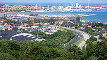 Port of Frederikshavn is the largest harbour in Frederikshavn. It is a commercial port owned by Frederikshavn Municipality.[26] It includes a ferry harbour, a cargo harbour and a large service industry. It has historically been dominated by the shipyard industry and fishing. Frederikshavn was in the late 19th century the dominant harbour for large fishing vessels in Denmark.[27] The European shipyard industry was hit with difficulties in the 1980s and Danyard, the largest shipyard in Frederikshavn closed in December 1999.[28] The municipality took over the harbour from the state in 2001.[26][9]:13 The site of the former Danyard was over the next 20 years transformed into a business park and the activity gradually went from manufacturing to service.[28]