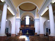 The church has a low concrete dome, by contrast to the spire of St Jude's. The interior features Tuscan columns with brick plinths, and a barrel vault. The interior is in pastel colours.[2]