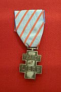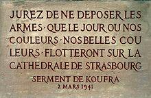 Capitaine de corvette Thierry d'Argenlieu[46] suggested the adoption of the Cross of Lorraine as a symbol of the Free French. This was chosen to recall the perseverance of Joan of Arc, patron saint of France, whose symbol it had been, the province where she was born, and now partially annexed into Alsace-Lorraine by the Third Reich, and as a response to the symbol of national-socialism, the Nazi swastika.[47]