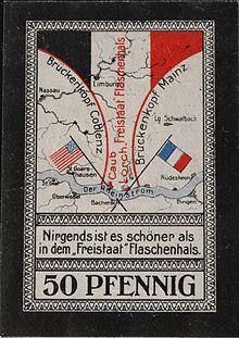 The Free State of Bottleneck (German: Freistaat Flaschenhals) was a short-lived quasi-state that existed from 10 January 1919 until 25 February 1923. It was formed out of part of the Prussian province of Hesse-Nassau as a consequence of the occupation of the Rhineland following World War I. The Bottleneck is now part of the modern German states of Hesse and Rhineland-Palatinate.