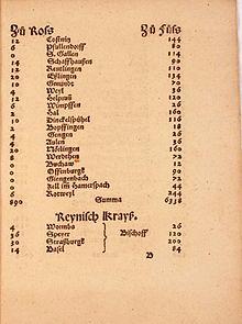 These same cities were among the 85 free imperial cities listed on the Reichsmatrikel of 1521,[7] the imperial civil and military tax-schedule used for more than a century to assess the contributions of all the Imperial Estates in case of a war formally declared by the Imperial Diet. The military and monetary contribution of each city is indicated in parenthesis (for instance Cologne (30-322-600) means that Cologne had to provide 30 horsemen, 322 footmen and 600 gulden).[8] These numbers are equivalent to one simplum. If need be, the Diet could vote a second and a third simplum, in which case each member's contribution was doubled or tripled. At the time, the Free imperial cities were considered wealthy and the monetary contribution of Nuremberg, Ulm and Cologne for instance were as high as that of the Electors (Mainz, Trier, Cologne, Palatinate, Saxony, Brandenburg) and the Dukes of Württemberg and of Lorraine.