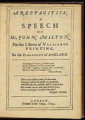 Until 1694, Great Britain had an elaborate system of licensing; the most recent was seen in the Licensing of the Press Act 1662. No publication was allowed without the accompaniment of a government-granted license. Fifty years earlier, at a time of civil war, John Milton wrote his pamphlet Areopagitica (1644).[20] In this work Milton argued forcefully against this form of government censorship and parodied the idea, writing "when as debtors and delinquents may walk abroad without a keeper, but unoffensive books must not stir forth without a visible jailer in their title." Although at the time it did little to halt the practice of licensing, it would be viewed later a significant milestone as one of the most eloquent defenses of press freedom.[20]