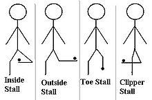 - Clipper or Jester (Chester) stall: The kicking foot is positioned behind the standing foot, and caught on the inside of the foot as in an inside stall. the name jester is often used by circle kickers.