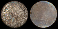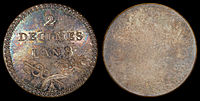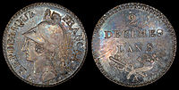 Coinage with explicit denominations in decimal fractions of the franc also began in 1795.[8] Decimalization of the franc was mandated by an act of 7 April 1795, which also dealt with the decimalization of weights and measures. France led the world in adopting the metric system and it was the second country to convert from a non-decimal to a decimal currency, following Russia's conversion in 1704,[9] and the third country to adopt a decimal coinage, also following the United States in 1787.[10] France's first decimal coinage used allegorical figures symbolizing revolutionary principles, like the coinage designs the United States had adopted in 1793.