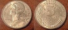 - 5 centimes (~ 0.76 cents) aluminium-bronze