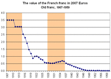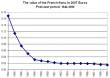 In January 1960 the French franc was revalued, with 100 existing francs making one nouveau franc.[11] The abbreviation "NF" was used on the 1958 design banknotes until 1963. Old one- and two-franc coins continued to circulate as new centimes (no new centimes were minted for the first two years). The one-centime coin never circulated widely. Inflation continued to erode the franc's value: between 1950 and 1960, price levels increased 72 per cent (5.7% per year on average); between 1960 and 1970, it increased 51 per cent (4.2%).[12] Only one further major devaluation occurred (11% in August 1969) before the Bretton Woods system was replaced by free-floating exchange rates. When the euro replaced the franc on 1 January 1999, the franc was worth less than an eighth of its original 1960 purchasing power.