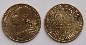 - 20 centimes (~ 3.05 cents) aluminium-bronze