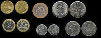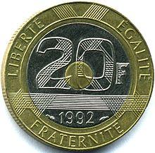 - 20 francs (~ €3.05) trimetallic, rarer (produced for a short period before the euro, the banknote equivalent was much more frequently used)