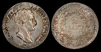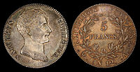 During the Consulship period (1799–1804) silver francs were struck in decimal coinage.[13] A five-franc coin was first introduced in 1801–02 (L’AN 10),[14] half-franc, one-franc, and gold 40-franc coins were introduced in 1802–03 (L’AN 11),[15] and quarter-franc and two-franc coins in 1803–04 (L’AN 12).[16]