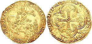 The first franc was a gold coin introduced in 1360 to pay the ransom of King John II of France. This coin secured the king's freedom and showed him on a richly decorated horse earning it the name franc à cheval[4] (meaning "free on horse" in French).[5] The obverse legend, like other French coins, gives the king's title as Francorum Rex ("King of the Franks" in Latin) and provides another reason to call the coin a franc. Its value was set as one livre tournois (a money of account). John's son, Charles V, continued this type. It was copied exactly at Brabant and Cambrai and, with the arms on the horse cloth changed, at Flanders. Conquests led by Joan of Arc allowed Charles VII to return to sound coinage and he revived the franc à cheval. John II, however, was not able to strike enough francs to pay his ransom and he voluntarily returned to English captivity.