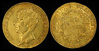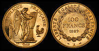 The gold coinage also changed. 40-franc coins were last struck in 1839 (with just 23 coins minted).[17] Several new denomination were introduced as gold coinage: 5 gold francs (1856),[18] 10 gold francs (1850),[19] 50 gold francs (1855),[18] and 100 gold francs (1855).[20] A second design for the 100 gold franc coin was released in 1878 depicting standing genius writing the constitution.[21] The pictured example (1889) was issued as a proof and only 100 coins were struck.[21]