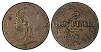 Copper coins were rarely issued between 1801 and 1848, so the quarter franc was the lowest current denomination in circulation. But during this period, copper coins from earlier periods circulated. A Napoleon 5-centime coin (in bell metal) and Napoleon and Restoration 1-décime coins were minted.
