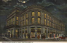The French Opera House, or Théâtre de l'Opéra, was an opera house in New Orleans. It was one of the city's landmarks from its opening in 1859 until it was destroyed by fire in 1919. It stood in the French Quarter at the uptown lake corner of Bourbon and Toulouse Streets, with the main entrance on Bourbon.