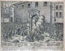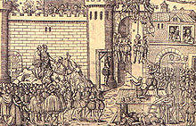 In the wake of the posters, the French monarchy took a harder stand against the protesters.[15][21] Francis had been severely criticized for his initial tolerance towards Protestants, and now was encouraged to repress them.[22] At the same time, Francis was working on a policy of alliance with the Ottoman Empire.[23] The ambassadors in the 1534 Ottoman embassy to France accompanied Francis to Paris. They attended the execution by burning at the stake of those caught for the Affair of the Placards, on 21 January 1535, in front of the Cathedral of Notre-Dame de Paris.[22]