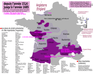 - ^ Hans J. Hillerbrand, Encyclopedia of Protestantism: 4-volume Set, paragraphs "France" and "Huguenots"; Hans J. Hillerbrand, an expert on the subject, in his Encyclopedia of Protestantism: 4-volume Set claims the Huguenot community reached as much as 10% of the French population on the eve of the St. Bartholomew's Day massacre, declining to 8% by the end of the 16th century, and further after heavy persecution began once again with the Revocation of the Edict of Nantes by Louis XIV of France.