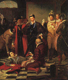 Refusing to return to Paris, Henry III called for an Estates-General at Blois in September 1588.[70] During the Estates-General, Henry III suspected that the members of the third estate were being manipulated by the League and became convinced that Guise had encouraged the duke of Savoy's invasion of Saluzzo in October 1588. Viewing the House of Guise as a dangerous threat to the power of the Crown, Henry III decided to strike first. On 23 December 1588, at the Château de Blois, Henry of Guise and his brother, the Cardinal de Guise, were lured into a trap by the King's guards.[71] The Duke arrived in the council chamber where his brother the Cardinal waited. The Duke was told that the King wished to see him in the private room adjoining the royal chambers. There guardsmen seized the duke and stabbed him in the heart, while others arrested the Cardinal who later died on the pikes of his escort. To make sure that no contender for the French throne was free to act against him, the King had the Duke's son imprisoned. The Duke of Guise had been highly popular in France, and the Catholic League declared open war against King Henry III. The Parlement of Paris instituted criminal charges against the King, who now joined forces with his cousin, the Huguenot, Henry of Navarre, to war against the League.