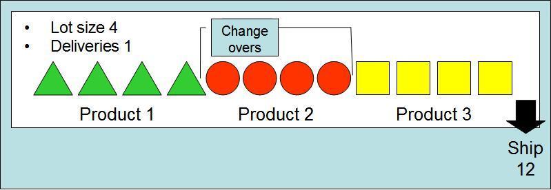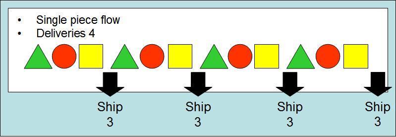 If we take this to the extreme where the factory now has a changeover after every unit of production (single piece flow) and where shipments occur after every campaign (every product has been made) then the factory has this situation.