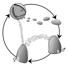 Capable of living for up to 130 years,[31] the freshwater pearl mussel begins life as a tiny larva, measuring just 0.6 to 0.7 millimetres long, which is ejected into the water from an adult mussel in a mass of one to four million other larvae. This remarkable event takes place over just one to two days, sometime between July and September.[6] The larvae, known as glochidia, resemble tiny mussels, but their minute shells are held open until they snap shut on a suitable host. The host of freshwater pearl mussel larvae are juvenile fish from the salmonid family, which includes the Atlantic salmon and sea trout.[6] The chances of a larva encountering a suitable fish are very low,[11] and thus nearly all are swept away and die; only a few are inhaled by an Atlantic salmon or sea trout, where they snap shut onto the fish's gills.[6]