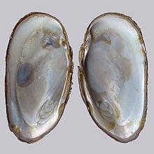 Like all bivalve molluscs, the freshwater pearl mussel has a shell consisting of two parts that are hinged together, which can be closed to protect the animal's soft body within.[8] The shell is large, heavy and elongated,[9][10] typically yellowish-brown in colour when young and becoming darker with age.[6] Older parts of the shell often appear corroded, an identifying feature of this mussel species.[11] The inner surface of the shell is pearl white, sometimes tinged with attractive iridescent colours.[9] Like all molluscs, the freshwater pearl mussel has a muscular 'foot';[8] this very large, white foot enables the mussel to move slowly and bury itself within the bottom substrate of its freshwater habitat.[9][10]