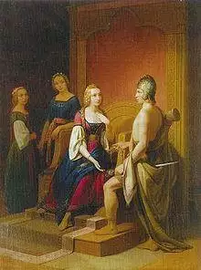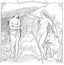 Völuspá contains a stanza that mentions Freyja, referring to her as "Óð's girl"; Freyja being the wife of her husband, Óðr. The stanza recounts that Freyja was once promised to an unnamed builder, later revealed to be a jötunn and subsequently killed by Thor (recounted in detail in Gylfaginning chapter 42; see Prose Edda section below).[21] In the poem Grímnismál, Odin (disguised as Grímnir) tells the young Agnar that every day Freyja allots seats to half of those that are slain in her hall Fólkvangr, while Odin owns the other half.[22]