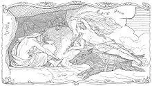 Freyja plays a part in the events leading to the birth of Sleipnir, the eight-legged horse. In chapter 42, High recounts that, soon after the gods built the hall Valhalla, a builder (unnamed) came to them and offered to build for them in three seasons a fortification so solid that no jötunn would be able to come in over from Midgard. In exchange, the builder wants Freyja for his bride, and the sun and the moon. After some debate the gods agree, but with added conditions. In time, just as he is about to complete his work, it is revealed that the builder is, in fact, himself a jötunn, and he is killed by Thor. In the meantime, Loki, in the form of a mare, has been impregnated by the jötunn's horse, Svaðilfari, and so gives birth to Sleipnir. In support, High quotes the Völuspá stanza that mentions Freyja.[36] In chapter 49, High recalls the funeral of Baldr and says that Freyja attended the funeral and there drove her cat-chariot, the final reference to the goddess in Gylfaginning.[37]