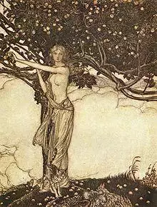 At the beginning of the book Skáldskaparmál, Freyja is mentioned among eight goddesses attending a banquet held for Ægir.[38] Chapter 56 details the abduction of the goddess Iðunn by the jötunn Þjazi in the form of an eagle. Terrified at the prospect of death and torture due to his involvement in the abduction of Iðunn, Loki asks if he may use Freyja's "falcon shape" to fly north to Jötunheimr and retrieve the missing goddess. Freyja allows it, and using her "falcon shape" and a furious chase by eagle-Þjazi, Loki successfully returns her.[39]