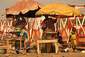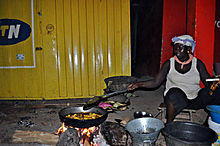 Kelewele is a popular Ghanaian food made of fried plantains seasoned with spices.[2] In English, it is sometimes referred to as hot plantain crisps.[3] In Accra, kelewele is usually sold at night by street vendors and sometimes in the afternoon by the country side women.[4][5][6] It can be served with beans stew, peanuts,[6] or alone as a dessert.[7] Kelewele is also a popular choice for dinner.[8]