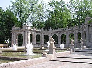 At the opposite end of the district, the Volkspark Friedrichshain is a large park serving the densely populated area of Prenzlauer Berg on the other side. Its distinctive features include the Märchenbrunnen (Fairytale Fountain) and two green and pleasant "mountains" consisting purely of rubble and the ruins of two World War II Flak towers.