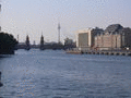 The Osthafen (east harbour) at the Spree between Friedrichshain and Kreuzberg. In the background the Oberbaumbrücke and the Fernsehturm.