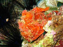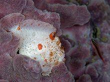 The unusual appearance of the frogfish functions to conceal it from predators and sometimes to mimic a potential meal to its prey. In the study of animal behavior, this is known as aggressive mimicry. Their unusual shape, colour, and skin textures disguise frogfish. Some resemble stones or coral, while others imitate sponges or sea squirts with dark splotches instead of holes. In 2005, a species was discovered, the striated frogfish, that mimics a sea urchin, while the sargassumfish is coloured to blend in with the surrounding sargassum.[5] Some frogfish are covered with algae or hydrozoa. Their camouflage can be so perfect that sea slugs have been known to crawl over the fish without recognizing them.