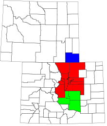 The Front Range Urban Corridor is an oblong region of urban population located along the eastern face of the Southern Rocky Mountains, encompassing 18 counties in the US states of Colorado and Wyoming. The corridor derives its name from the Front Range, the mountain range that defines the western boundary of the corridor which serves as a gateway to the Rocky Mountains. The region comprises the northern portion of the Southern Rocky Mountain Front geographic area, which in turn comprises the southern portion of the Rocky Mountain Front geographic area of Canada and the United States. The Front Range Urban Corridor had an estimated population of 4,976,781 on July 1, 2018, an increase of +14.84% since the 2010 United States Census.[1] It is estimated that the population exceeded 5 million in 2019. Roughly 98% of the population within the entire urban corridor region is within Colorado and roughly 85% of Colorado's population resides within the urban corridor region.