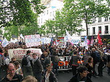 For the 2002 presidential election, opinion polls had predicted a run-off between incumbent President Chirac and PS candidate Lionel Jospin.[132][133] The shock was thus great when Le Pen unexpectedly beat Jospin (by 0.7%) in the first round.[133] This resulted in the first presidential run-off since 1969 without a leftist candidate, and the first ever with a candidate of the far-right.[134] To Le Pen's advantage, the election campaign had increasingly focused on law and order issues, helped by media attention on a number of violent incidents.[135] Jospin had also been weakened due to the competition between an exceptional number of leftist parties.[136] Nevertheless, Chirac did not even have to campaign in the second round, as widespread anti-Le Pen protests from the media and public opinion culminated on May Day, with an estimated 1.5 million demonstrators across France.[137] Chirac also refused to debate with Le Pen, and the traditional televised debate was cancelled.[138] In the end, Chirac won the presidential run-off with an unprecedented 82.2% of the vote and with 71% of his votes—according to polls—cast simply "to block Le Pen".[138] Following the presidential election, the main centre-right parties merged to form the broad-based Union for a Popular Movement (UMP).[139] The FN failed to hold on to Le Pen's support for the 2002 legislative elections, in which it got 11.3% of the vote.[140] It nevertheless outpolled Mégret's MNR, which won a mere 1.1% support, even though it had fielded the same number of candidates.[141]
