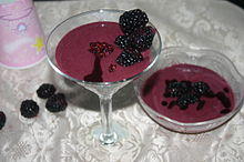 Foole is first mentioned as a dessert in 1598, made of 'clouted creame'[1] although the origins of gooseberry fool may date back to the 15th century.[2] The earliest recipe for fruit fool dates to the mid 17th century.[3] Why the word "fool" is used as the name of this fruit dessert is not clear. Several authors derive it from the French verb fouler meaning "to crush" or "to press" (in the context of pressing grapes for wine),[4] but this derivation is dismissed by the Oxford English Dictionary as baseless and inconsistent with the early use of the word.[1] The name trifle was also originally applied to the dish, with the two names being used interchangeably.[5]