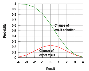 Fudge uses customized "Fudge dice" which have an equal number of plus, minus and blank sides. A number of these dice are rolled, usually four at a time ("4dF" in Fudge dice notation), and for every plus side that comes up the result of using the Trait is considered one step higher (e.g. from Fair to Good) and for every minus side that comes up the result is considered one step lower. The goal is to match or surpass the difficulty level, also on the adjective scale, of the test. Thus, a Good attribute is considered to be Great if the player were to roll two plus sides, one minus side, and one blank—the minus side cancels out one of the plus sides and the remaining plus side raises the result by one step. The same Good attribute would be considered Poor if you were to roll three minus sides and one blank. The same dice roll can be achieved with six-sided dice, treating a 1 or 2 as [−], a 3-4 as [ ] and a 5-6 as [+].
