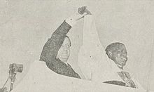 This mysticism was carried over into the electoral campaign. Acts of violence became the method of political action for the Bacongo militants which he oversaw.[23] Thus on 12 December 1955, tracts by his supporters called for the Matswanists who had not joined Abbé to be "whipped".[24] One of them, Victor Tamba-Tamba, saw his house burnt down and his entire family killed on 28 December.[24] The agitation reached fever pitch on 10 October 1956, the day of the election: when the polls of Bacongo were opened, Lari youth took it upon themselves to kill voters whom they suspected of not voting for Youlou.[23] The authorities had to send out security forces to protect the polling stations.[24] Calm did not long return to Brazzaville. In the following two days, a number of houses were destroyed, four thousand people were killed and several thousands were wounded.[24] Fulbert Youlou and one of his opponents, Jacques Opangault, called for calm by radio.[24]
