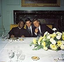 Among the guests of this conference were the President of the Democratic Republic of Congo, Joseph Kasa-Vubu, and the Katanga leader Moïse Tshombe.[89] Abbé undoubtedly brought them together in order to isolate the Congolese nationalist Patrice Lumumba, accused of communist sympathies.[89] Although he invited both, Youlou showed more support for the very controversial Tshombe than for Kasa-Vubu.[45] In exchange for economic assistance with the planned Sounda dam, Youlou provided Tshombe with logistical support necessary for the separatist regime.[90] However, his counterpart in Léopoldville was a Kongo like him; they appeared at the time to cherish the hope of reuniting a massive Bakongo state.[45] Abbé took other controversial positions; although Angola was subject to violent colonial repression, he was the only leader to call for dialogue with the Portuguese dictator Salazar.[91]
