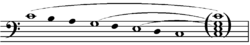 The upper voice of a fundamental structure, which is the fundamental line, utilizes the descending direction; the lower voice, which is the bass arpeggiation through the fifth, takes the ascending direction (fig. 1). [...] The combination of fundamental line and bass arpeggiation constitutes a unity. [...] Neither the fundamental line nor the bass arpeggiation can stand alone. Only when acting together, when unified in a contrapuntal structure, do they produce art.[2]