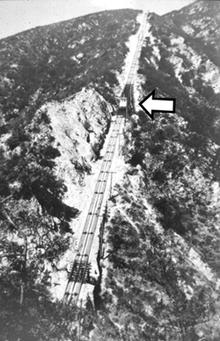 The Great Incline funicular of the Mount Lowe Railway (1893–1938). The arrow indicates the location of the car on the Macpherson Trestle. Grade: 62%.