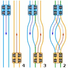 Illustration of four-rail, three-rail and two-rail layouts. Rails coloured green are shared by both cars. Note the unconventional 'double flanged' wheels and the gaps (Points) in the rails in the two-rail layout.