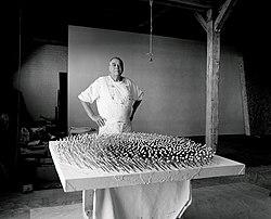 In addition to numerous Gruppo Zero exhibitions, Uecker has participated in many other exhibitions, including documenta 4, Kassel, Germany (1968), the Venice Biennale (1970), and numerous solos shows, including one at the Kunsthalle Düsseldorf (1983), a retrospective at the Kunsthalle der Hypo-Kulturstiftung, Munich (1990), and another solo show at the Ulmer Museum, Ulm, Germany (2010).[2] He had his first solo exhibition in the United States at the Howard Wise Gallery on West 57th Street, showing important work such as the kinetic New York Dancer I (1966).[3] He designed the scenery for Richard Wagner's Lohengrin at Bayreuth (1979–82).