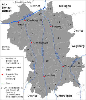 Günzburg is a Landkreis (district) in Swabia, Bavaria, Germany. It is bounded by (from the north and clockwise) the districts of Dillingen, Augsburg, Unterallgäu and Neu-Ulm, and by the state of Baden-Württemberg (districts Alb-Donau and Heidenheim).