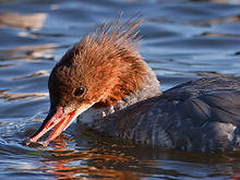 All birds of the family Anatidae (ducks, geese, and swans) have a nail, a plate of hard horny tissue at the tip of the beak.[72] This shield-shaped structure, which sometimes spans the entire width of the beak, is often bent at the tip to form a hook.[73] It serves different purposes depending on the bird's primary food source. Most species use their nails to dig seeds out of mud or vegetation,[74] while diving ducks use theirs to pry molluscs from rocks.[75] There is evidence that the nail may help a bird to grasp things; species which use strong grasping motions to secure their food (such as when catching and holding onto a large squirming frog) have very wide nails.[76] Certain types of mechanoreceptors, nerve cells that are sensitive to pressure, vibration or touch, are located under the nail.[77]