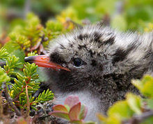 Gapes of juvenile altricial birds are often brightly coloured, sometimes with contrasting spots or other patterns, and these are believed to be an indication of their health, fitness and competitive ability. Based on this, the parents decide how to distribute food among the chicks in the nest.[43] Some species, especially in the families Viduidae and Estrildidae, have bright spots on the gape known as gape tubercles or gape papillae. These nodular spots are conspicuous even in low light.[44] A study examining the nestling gapes of eight passerine species found that the gapes were conspicuous in the ultraviolet spectrum (visible to birds but not to humans).[45] Parents may, however, not rely solely on the gape coloration, and other factors influencing their decision remain unknown.[46]
