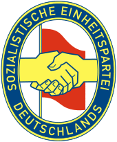 The ruling communist party, known as the Socialist Unity Party of Germany (SED), formed in April 1946 from the merger between the Communist Party of Germany (KPD) and the Social Democratic Party of Germany (SPD).[33] The two former parties were notorious rivals when they were active before the Nazis consolidated all power and criminalised them, and official East German and Soviet histories portrayed this merger as a voluntary pooling of efforts by the socialist parties and symbolic of the new friendship of German socialists after defeating their common enemy; however, there is much evidence that the merger was more troubled than commonly portrayed, and that the Soviet occupation authorities applied great pressure on the SPD's eastern branch to merge with the KPD, and the communists, who held a majority, had virtually total control over policy.[34] The SED remained the ruling party for the entire duration of the East German state. It had close ties with the Soviets, which maintained military forces in East Germany until the dissolution of the USSR in 1991 (the Russian Federation continued to maintain forces in the territory of the former East Germany until 1994), with the stated purpose of countering NATO bases in West Germany.