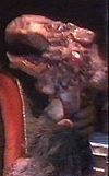The Kinitawowi were originally bred as quartermasters aboard deep space starships.[3] They lead a primitive tribal existence on various moons and asteroids. Their space is bordered by gigantic stone warning beacons that resemble skulls many miles across carved out of asteroids, seen in the series VI episode "Emohawk: Polymorph II" (1993). In the episode, second technician Arnold Rimmer (Chris Barrie) recalls from old space legends that unfortunate humans that unwittingly wandered into Kinitawowi space were often skinned alive to make beanbags. Nevertheless, as the 4000 Series service mechanoid Kryten (Robert Llewellyn) explains, the Kinitawowi were one of the friendlier tribes of humanoid GELFs and that they didn't always kill on sight as other humanoid GELFs apparently do. Indeed, not skinning strangers alive on sight was considered a warm greeting.[4]