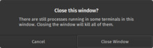 In recent versions, when the user attempts to quit the entire graphical application, GNOME Terminal will prompt the user with a dialog box to confirm if the user truly wants to exit GNOME Terminal.[3] This feature is intended to reduce the risk of accidentally closing a terminal window (e.g., by clicking the window's close button) with a job still running. If a job is running and the user closes the window, the job will quit and the user will have to restart the job if exiting was an accident.
