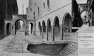 A triple-arched gateway built by Hadrian as an entrance to the eastern forum of Aelia Capitolina was traditionally, but as archaeological investigation shows, mistakenly,[5] said to have been part of the gate of Herod's Antonia Fortress. This was alleged to be the location of Jesus' trial and Pilate's Ecce homo speech.