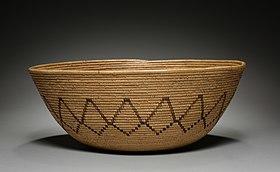 Using the stems of rushes (Juncus sp .), grass (Muhlenbergia rigens), and squawbush (Rhus trilobata), women fabricated coiled and twined basketry in a three-color pattern for household use, seed collecting, and ceremonial containers to hold grave offerings.[69] They sealed some baskets, such as water bottles, with asphalt to make watertight containers for holding liquids.[70]