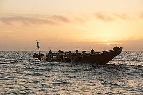 The Tongva had a concentrated population along the coast. They fished and hunted in the estuary of the Los Angeles River, and like the Chumash, their neighbors to the north and west along the Pacific coast, the Gabrieleño built seaworthy plank canoes, called te'aat, from driftwood. To build them, they used planks of driftwood pine that were sewn together with vegetable fiber cord, edge to edge, and then glued with the tar that was available either from the La Brea Tar Pits, or as asphalt that had washed up on shore from offshore oil seeps. The finished vessel was caulked with plant fibers and tar, stained with red ochre, and sealed with pine pitch. The te'aat, as noted by the Sebastián Vizcaíno expedition, could hold up to 20 people[50] as well as their gear and trade goods. These canoes allowed the development of trade between the mainland villages and the offshore islands, and were important to the region's economy and social organization,[51][52] with trade in food and manufactured goods being carried on between the people on the mainland coast and people in the interior as well. The Gabrieleño regularly paddled their canoes to Catalina Island, where they gathered abalone,[53] which they pried off the rocks with implements made of fragments of whale ribs or other strong bones.[54]